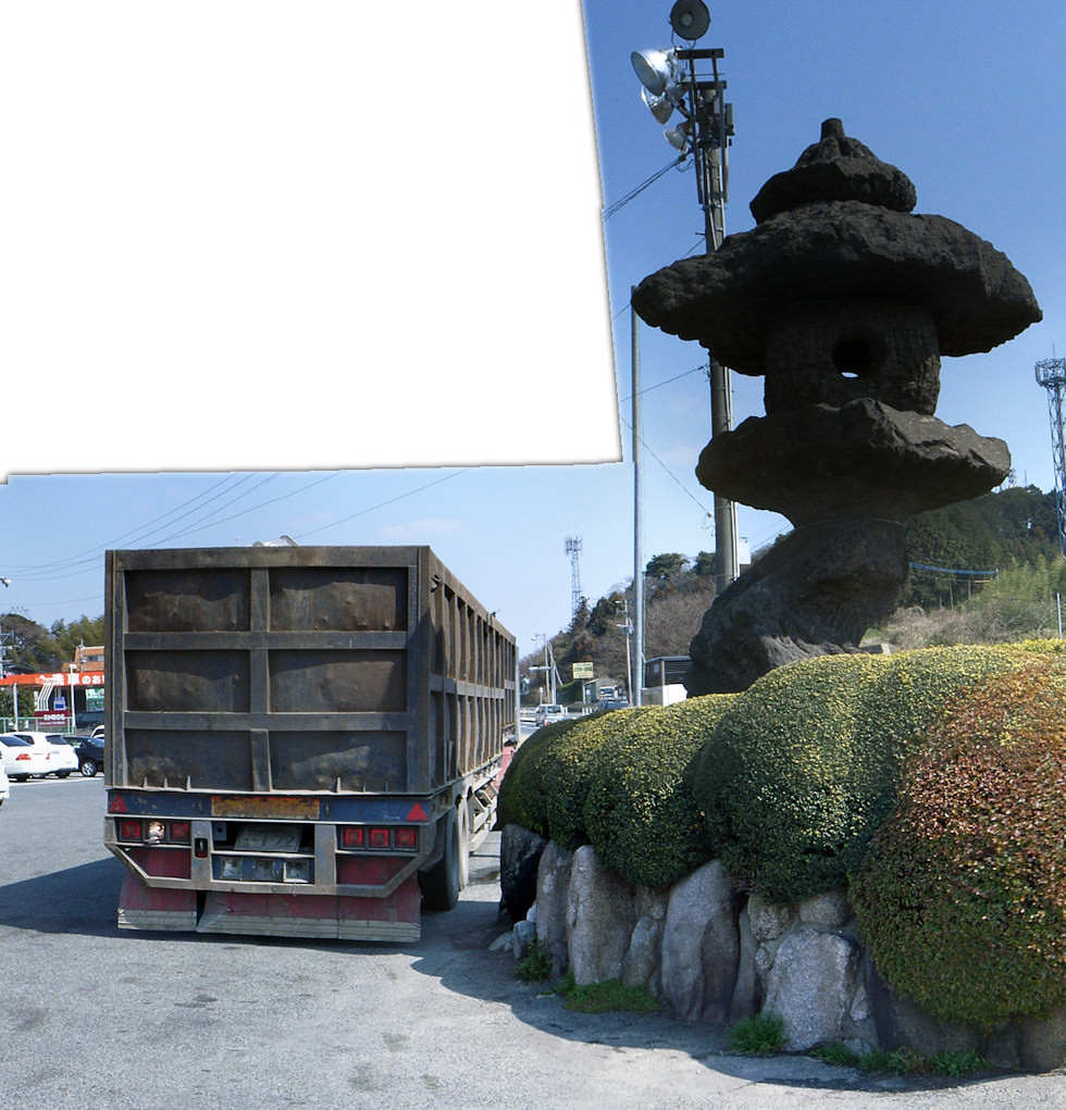 この石灯籠の大きさ、ダンプと比較して見て