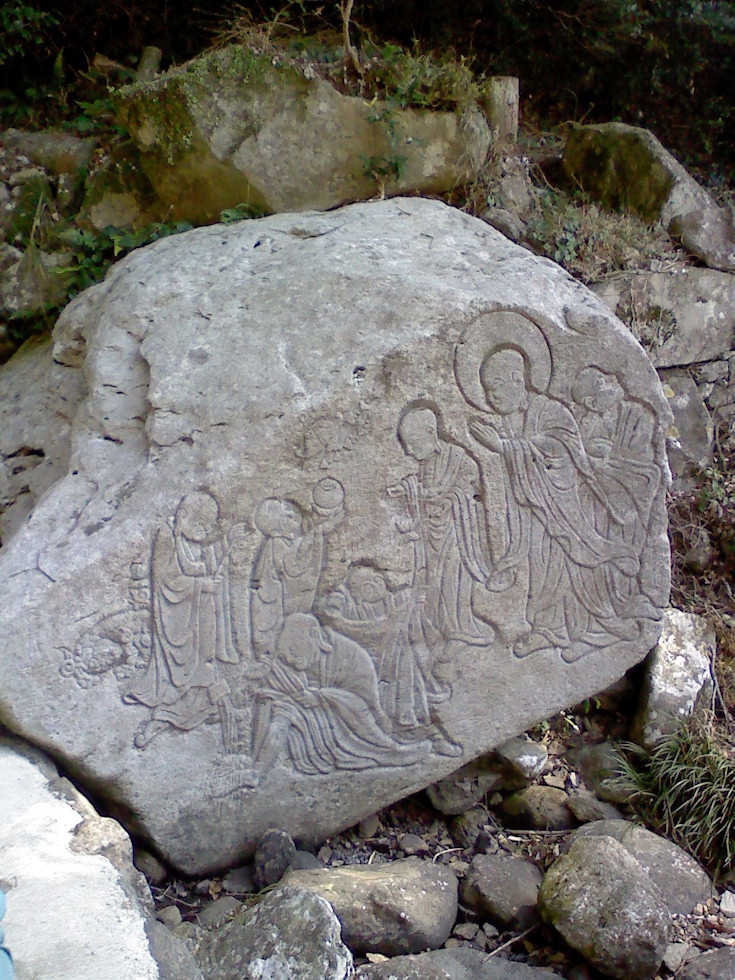 ・渓谷の河原の大きな石に、誰かが寄進された